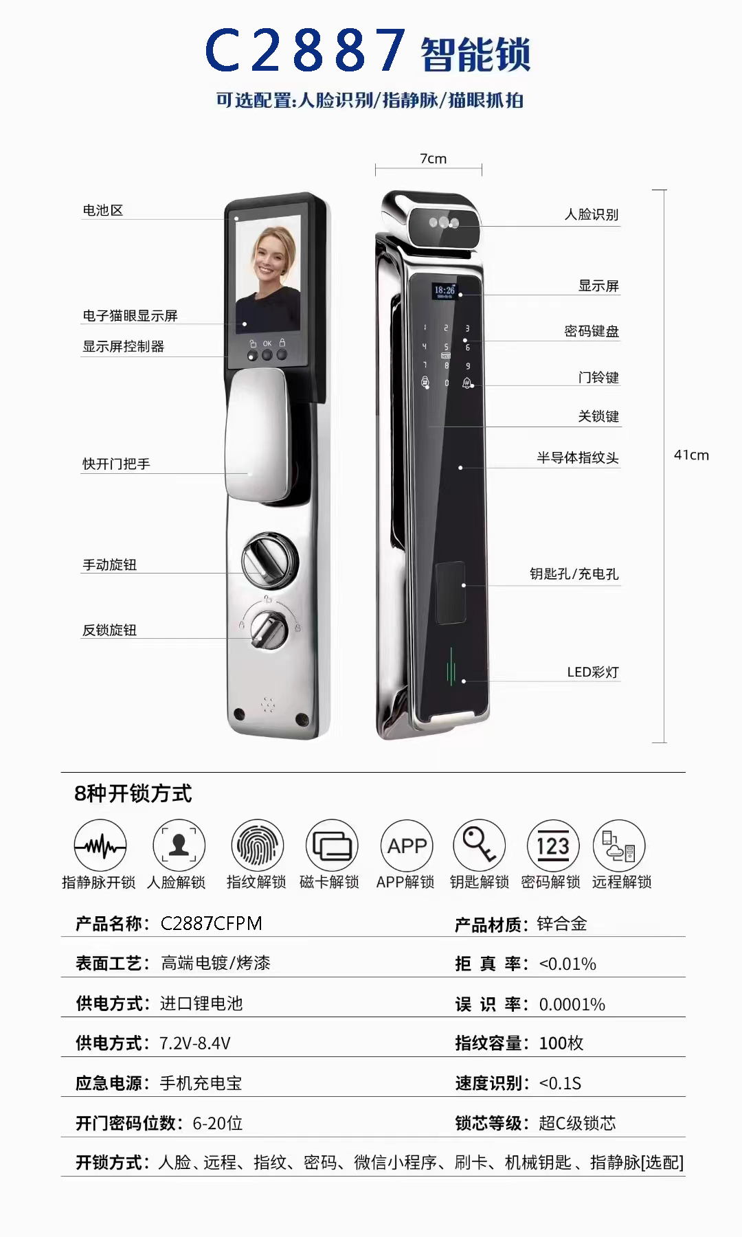 產(chǎn)品描述:人臉,視頻,指紋,貓眼,密碼,NFC,一卡通,應(yīng)急電源,應(yīng)急鑰匙